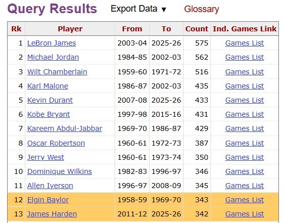 NBA常规赛历史30+场次纪录由詹姆斯保持(575场)。迈克尔·乔丹(562场)排名第二!